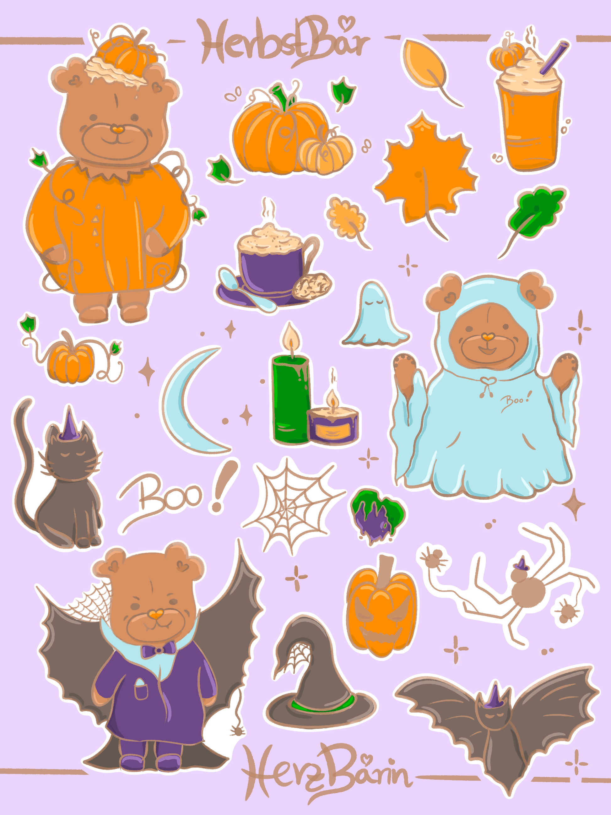 Die schönsten Elemente des Herbstes und Halloween in einem HerzBärin-Stickersheet. Handgemacht mit Herz.