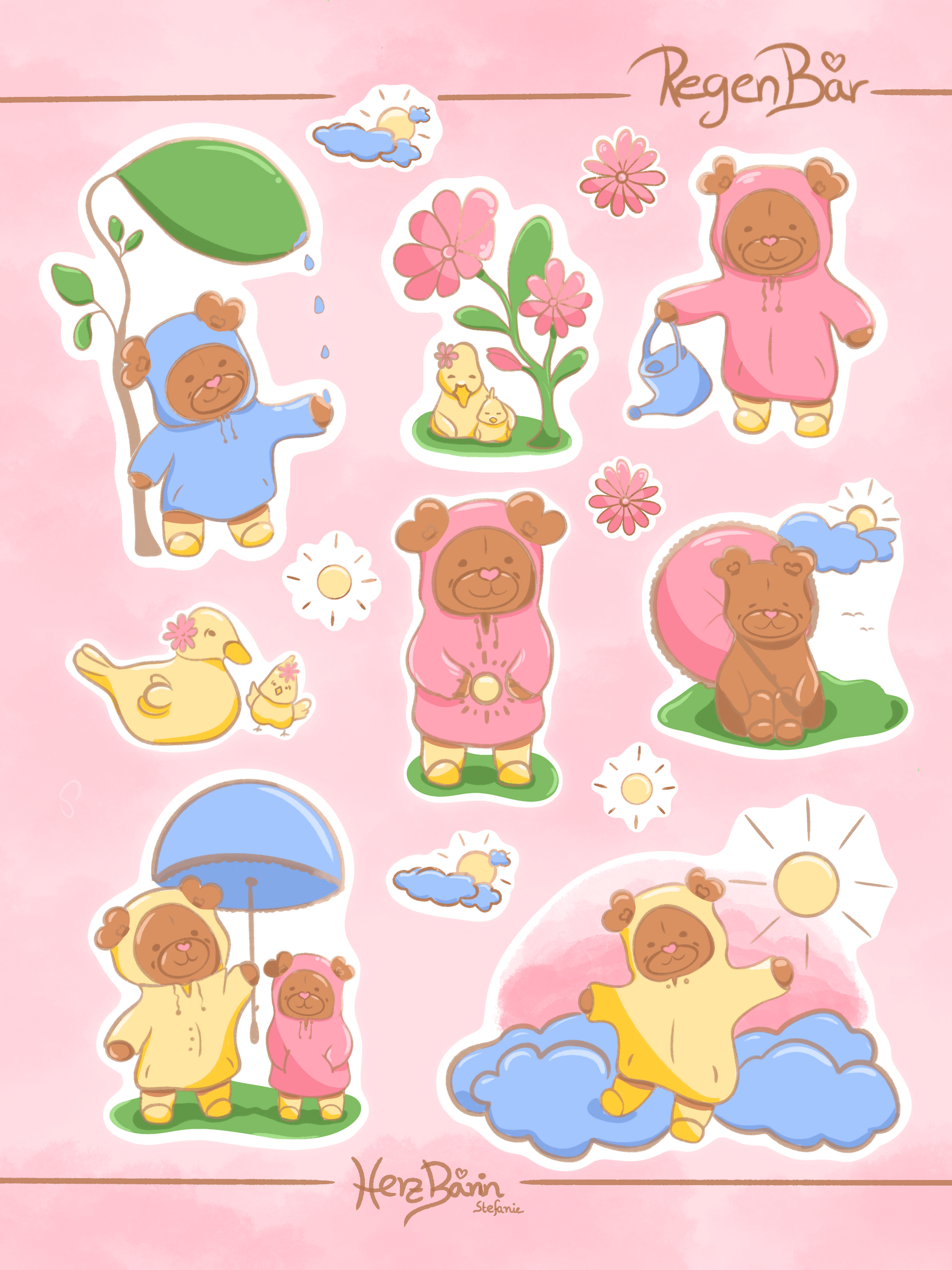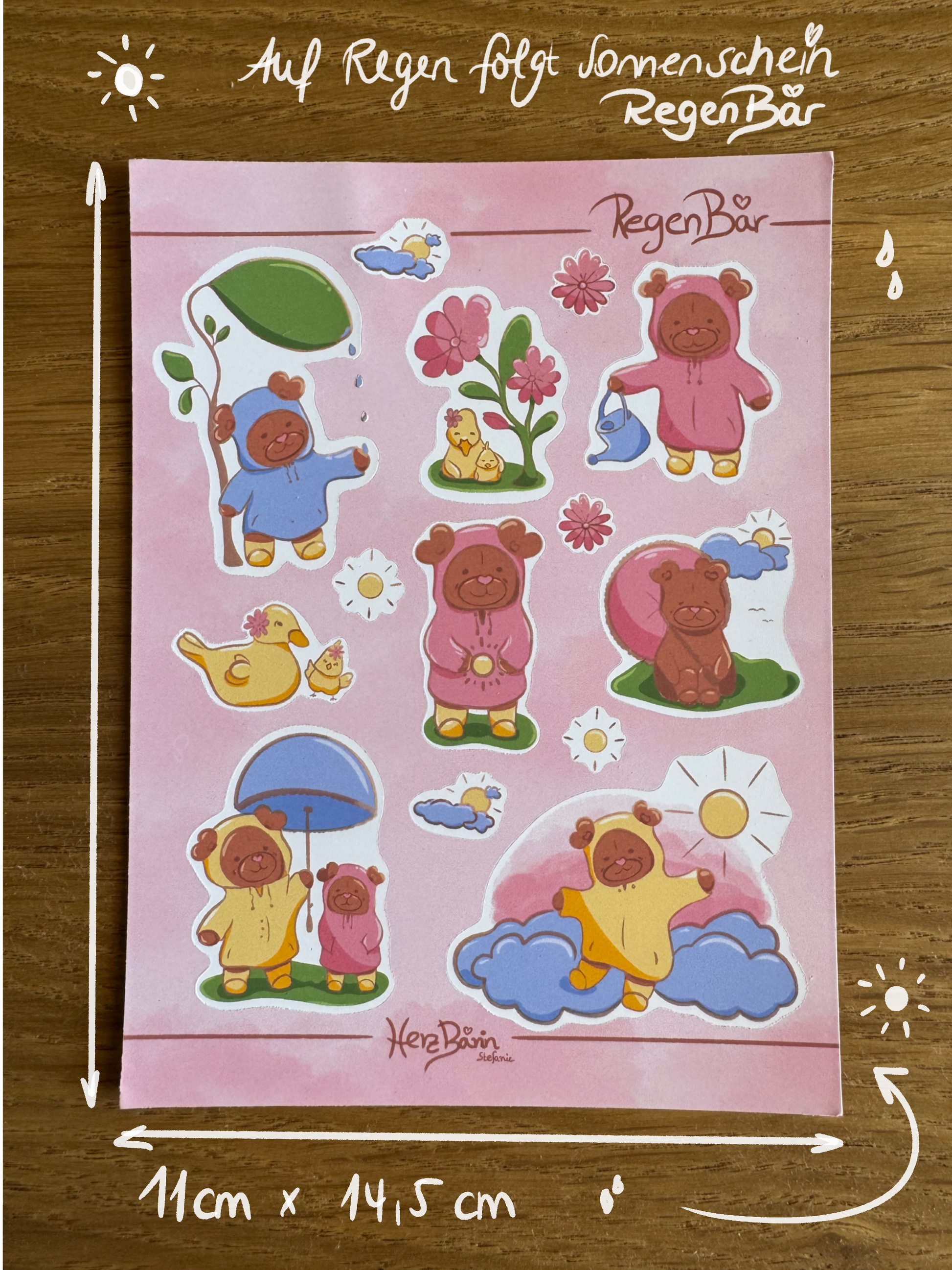 Sonnenschein und Regen in einem HerzBärin-Stickersheet. Handgemacht mit Herz.